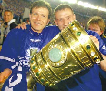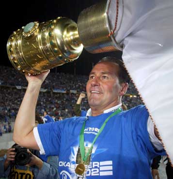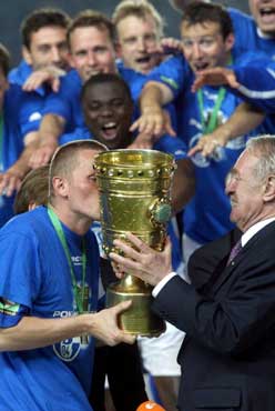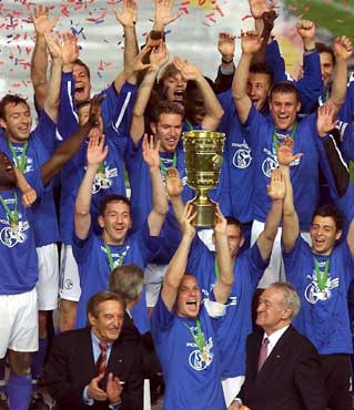 Der Pott bleibt im Pott !! Durch ein grandioses 4:2 gg. Bayer Leverkusen verteidigten die Knappen in dramatischen 90 Minuten den DFB-Pokal. Jörg Böhme glich durch eine fulminanten Freistoß die Bayer-Führung durch Berbatov aus. Nach der Pause schossen Victor Agali, Andreas Möller und Ebbe Sand, in einer furiosen Vietelstunde eine nicht mehr einzuholende Führung heraus. Ulf Kirsten gelang in der Schlussminute noch der Anschlußtreffer zum 4:2 Endstand.